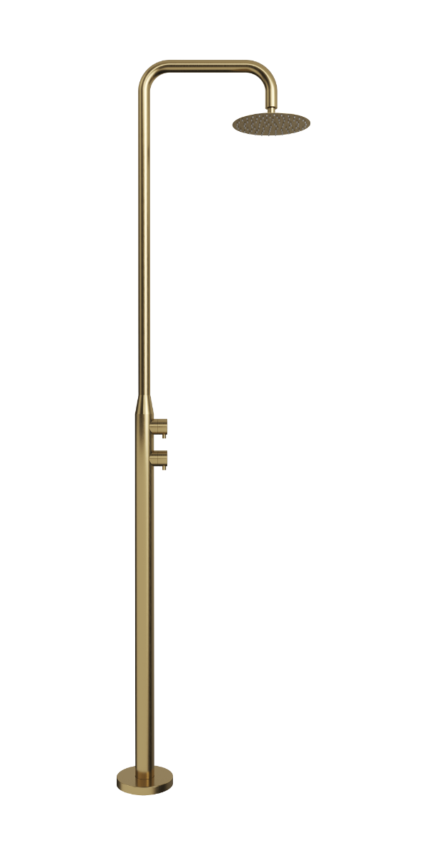 Finished in a refined brushed gold, this premium outdoor shower brings architectural elegance while standing up to salt air, chlorine, and harsh weather.
